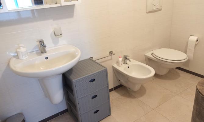 Nell'antibagno troverete la lavatrice e l'attrezzatura per pulire. Girando a sinistra si entra nel bagno che pur essendo cieco è dotato di aspiratore. E' molto spazioso e la doccia è ricavata in una nicchia chiusa da un box a due porte. In questo modo non c'è modo di bagnare il pavimento del bagno.